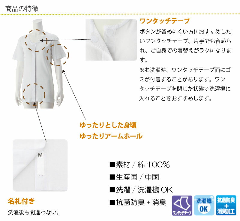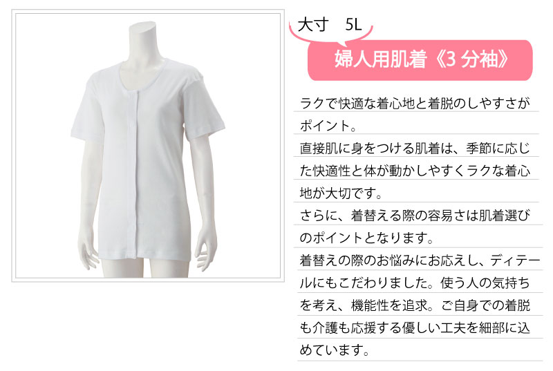 ワンタッチ肌着 下着 前開き レディース 婦人 用 綿100% 介護 マジックテープ式 3分袖 5L 半袖 大きめ 大きいサイズ 春夏 介護用 肌着 介護下着 シャツ 高齢者 女性 シニア