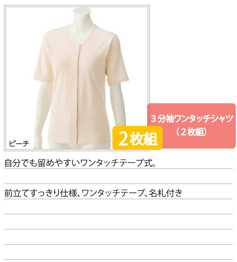 ワンタッチ肌着 下着 前開き レディース 婦人 用 綿100% 介護 ワンタッチテープシャツ 3分袖 2枚セット 半袖 S M L LL 春夏 介護用 肌着 介護下着 シャツ 高齢者 女性 シニア