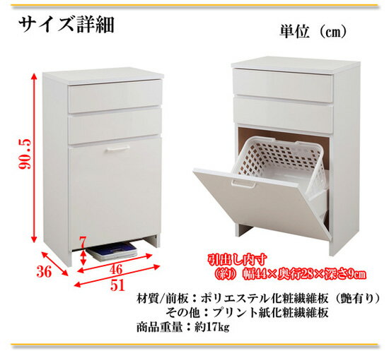 ・安心の国産・日本製! ・すぐに使えて、頑丈な完成品! ・オシャレで高級感のある前板艶有り! サニタリーラック/ランドリーボックス 脱衣バスケット収納付き! 鏡面仕上げ ロータイプ の詳細 商品名 鏡面仕上げバスケット付きランドリーラック 幅51cm 型番 幅51cmロータイプ ホワイト NO-0042 幅51cmロータイプ ピンク NO-0043 幅51cmハイタイプ ホワイト NO-0044 幅51cmハイタイプ ピンク NO-0045 ロータイプ サイズ 本体:(約)幅51×奥行36×高さ90.5cm 引出し内寸:(約)幅44×奥行き28×深さ9cm 扉内寸:(約)幅43×奥行き32×高さ40cm オープン部内寸:(約)幅46×奥行き34×高さ41cm ハイタイプ サイズ 本体:(約)幅51×奥行36×高さ180.5cm 引出し内寸:(約)幅44×奥行き28×深さ9cm 扉内寸:(約)幅43×奥行き32×高さ40cm バスケット外寸:(約)幅40×奥行き30×高さ27cm 材質 天板・前板:ポリエステル化粧繊維板、その他:プリント紙化粧繊維板、バスケット:ポリプロピレン 商品重量 ロータイプ:17kg ハイタイプ:26kg その他 完成品、バスケット外寸:幅40×奥行き30×高さ27cm 梱包サイズ ロータイプ:約:幅52×奥行37×高さ92cm ハイタイプ:約:幅52×奥行37×高さ92cm × 2個口でお届け 原産国 日本製 ジャンル 家具・インテリア > 収納ラック・収納棚 > サニタリーラック > 鏡面仕上げ ランドリー収納 / ランドリーボックス NO0042 NO0043 NO0044 NO0045 nasa ナサ 脱衣バスケット ランドリー引出し ゴミ箱付きキッチンカウンター キッチン収納 キッチンラック 玄関ラック 洗濯物入れ 広告文責 (有)アテーネシステム 076-254-0238サニタリーラック/ランドリーボックス 脱衣バスケット収納付き! 鏡面仕上げ ロータイプ